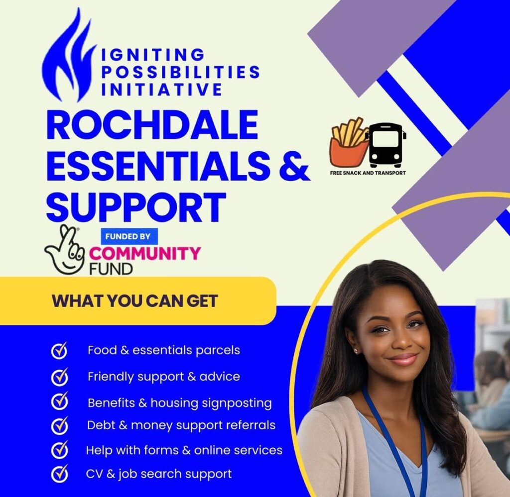 Rochdale Essentials & Support is a 10-month project by Igniting Possibilities Initiative supporting people in Rochdale with practical help during difficult times. The project offers food and essentials parcels, support and advice, benefits and housing signposting, debt and money referrals, help with forms and online services, and CV and job search support. Free snacks and transport are also available to make support easier to access. The aim is to give residents clear, practical help that improves wellbeing, reduces pressure, and supports long-term independence.